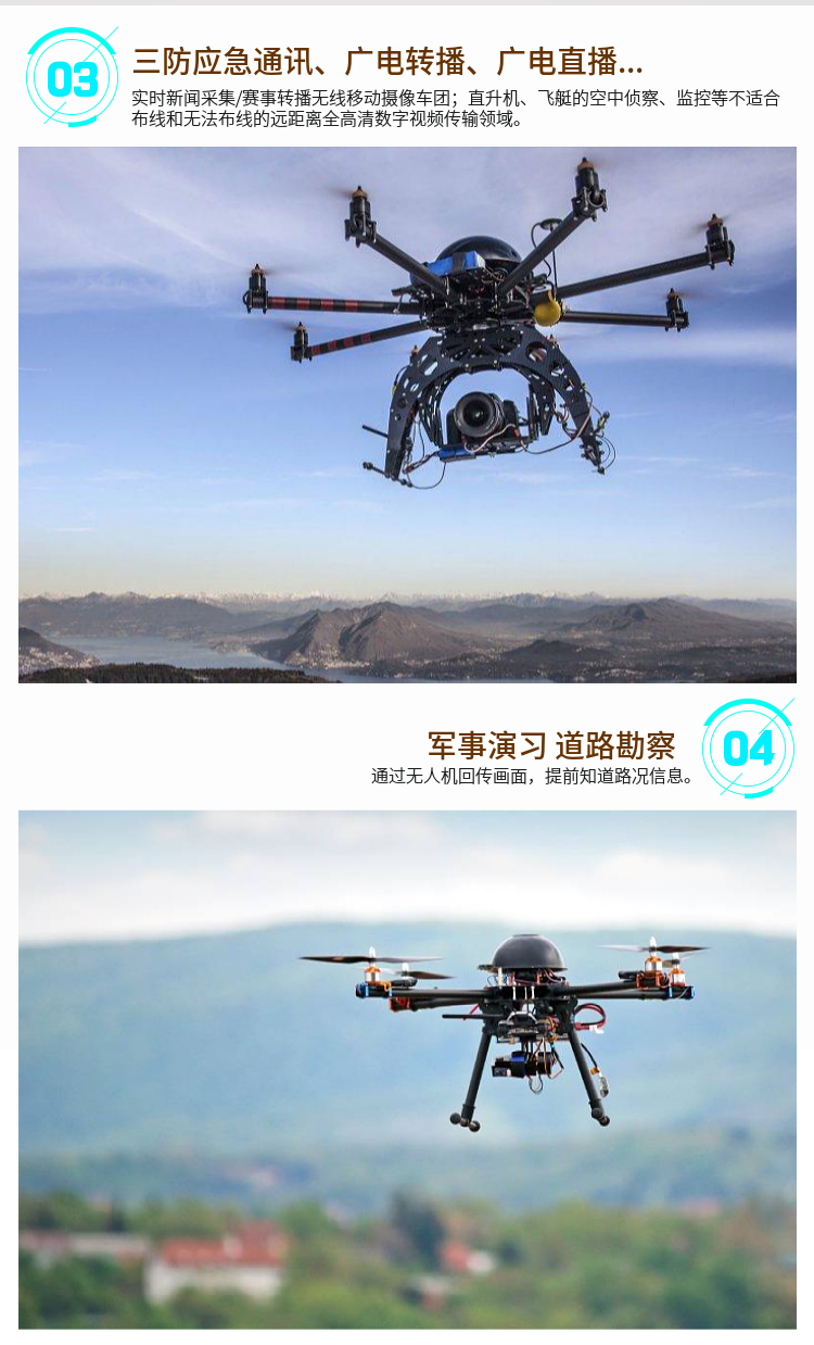 廣泛應(yīng)用于軍事偵察、邊防巡邏、公安技偵、航拍、空中測繪、電力巡查、鐵路搶險、海事執(zhí)法、城管執(zhí)法、新聞密訪、衛(wèi)生防疫等或突發(fā)事件應(yīng)急指揮、無人車、無人船、特種機器人等領(lǐng)域。設(shè)備體積小可偽裝做密訪取證、空中作業(yè)圖傳、無人機無線圖像傳輸。